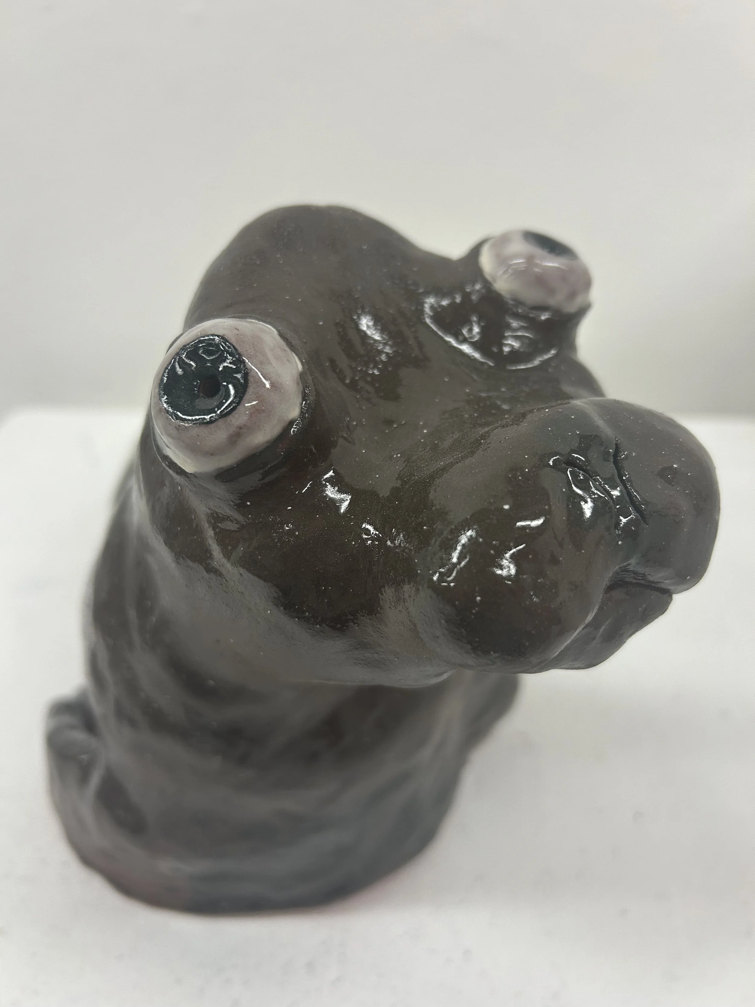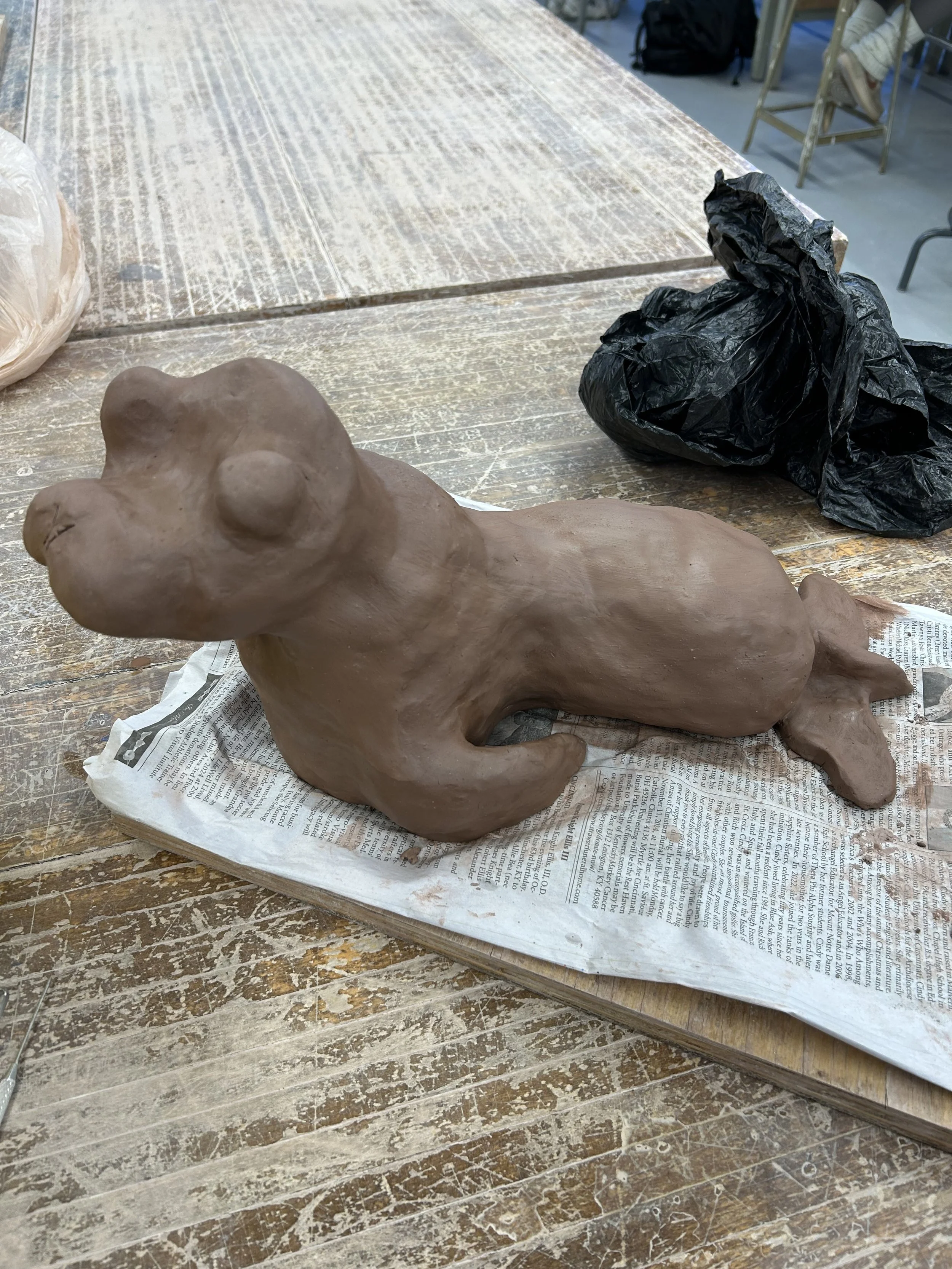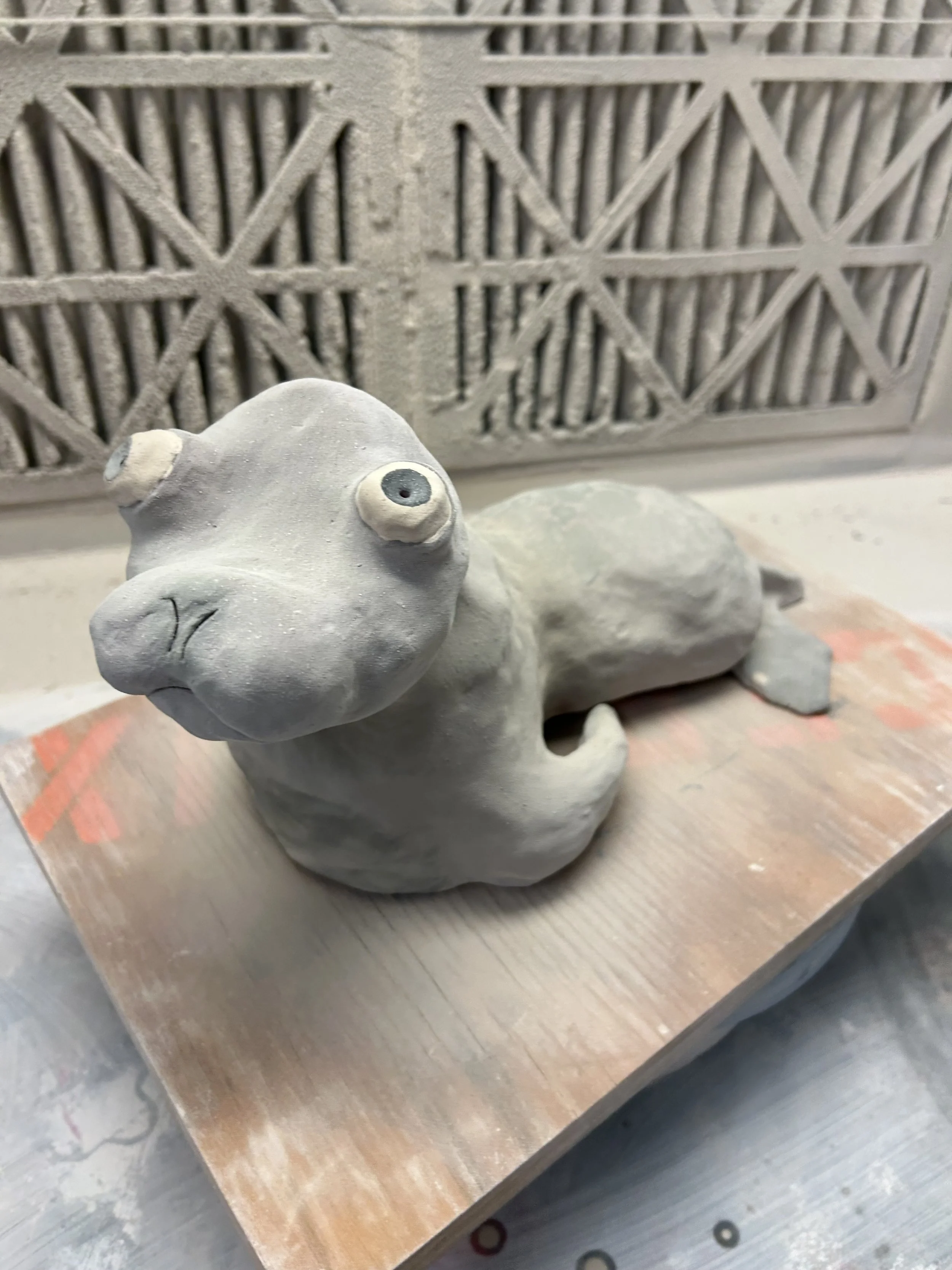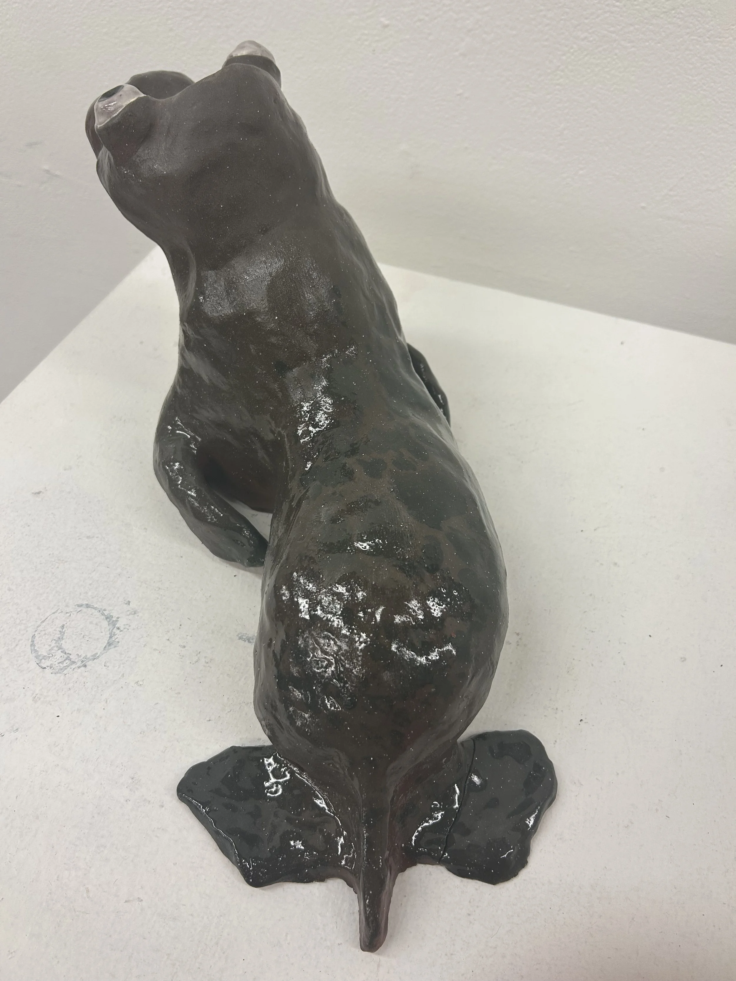 This project was to create an animal form, so I chose a seal. The figure was shaped, then hollowed out. He was bisque fired, then glazed, which was sprayed on.