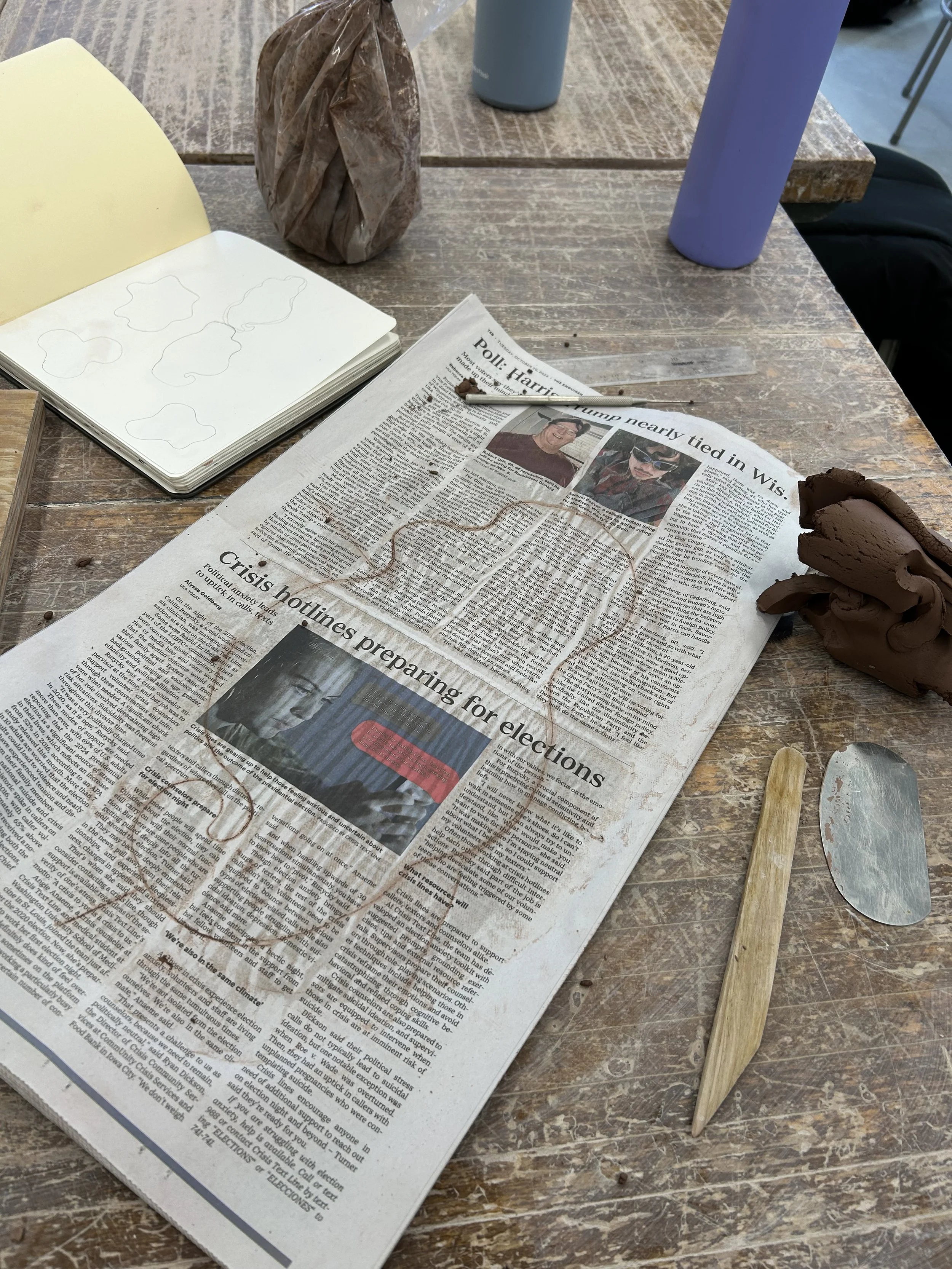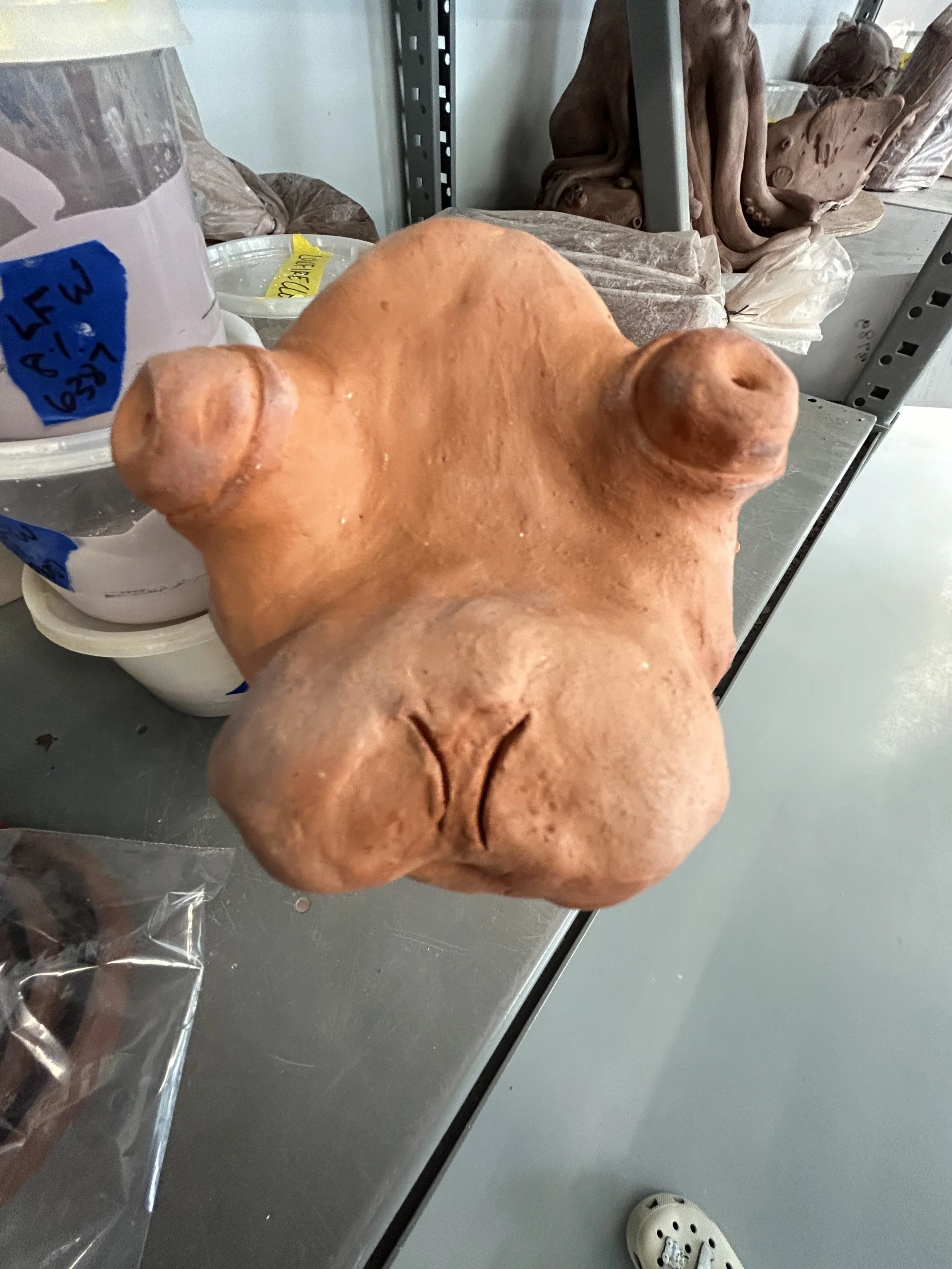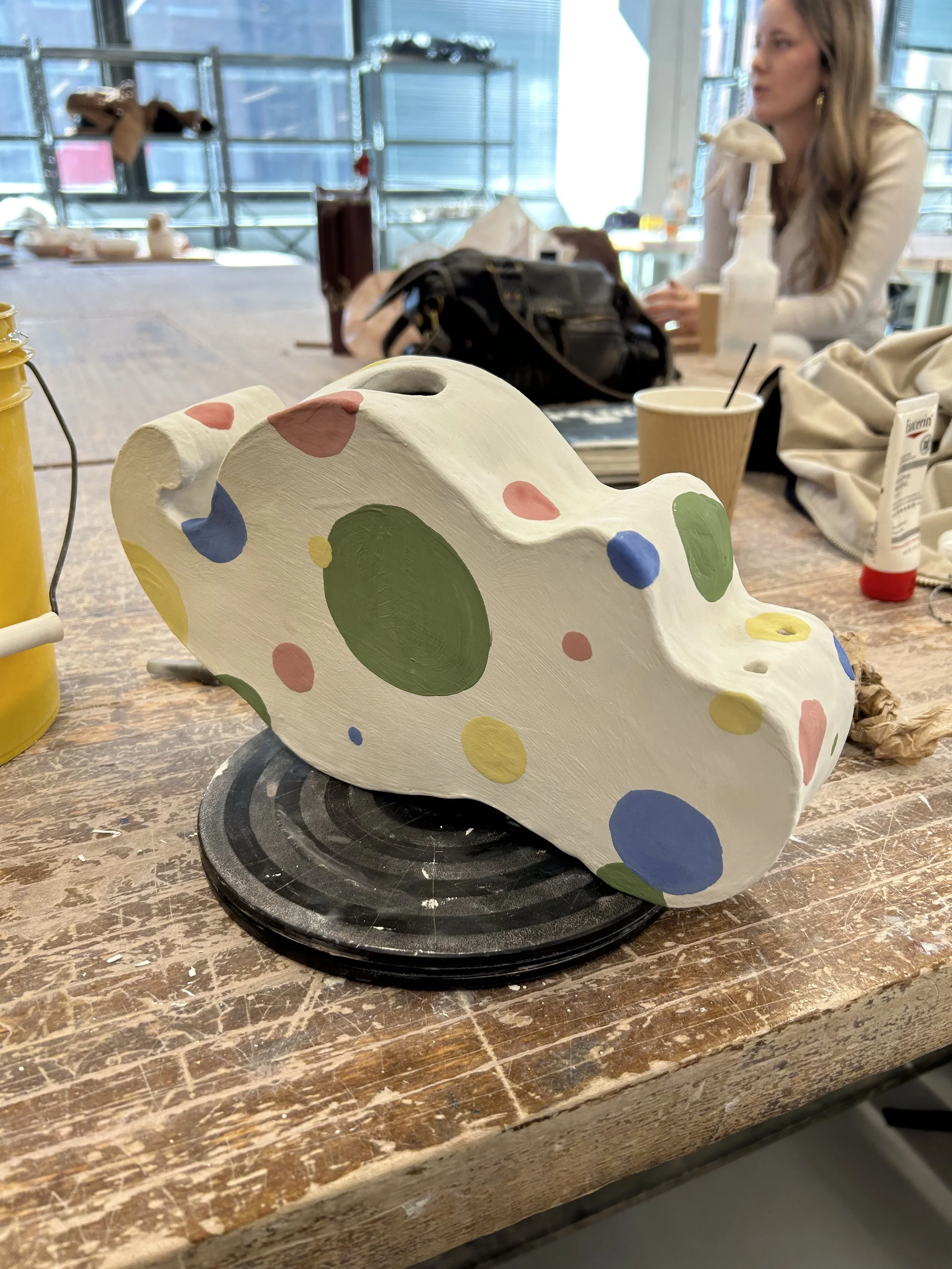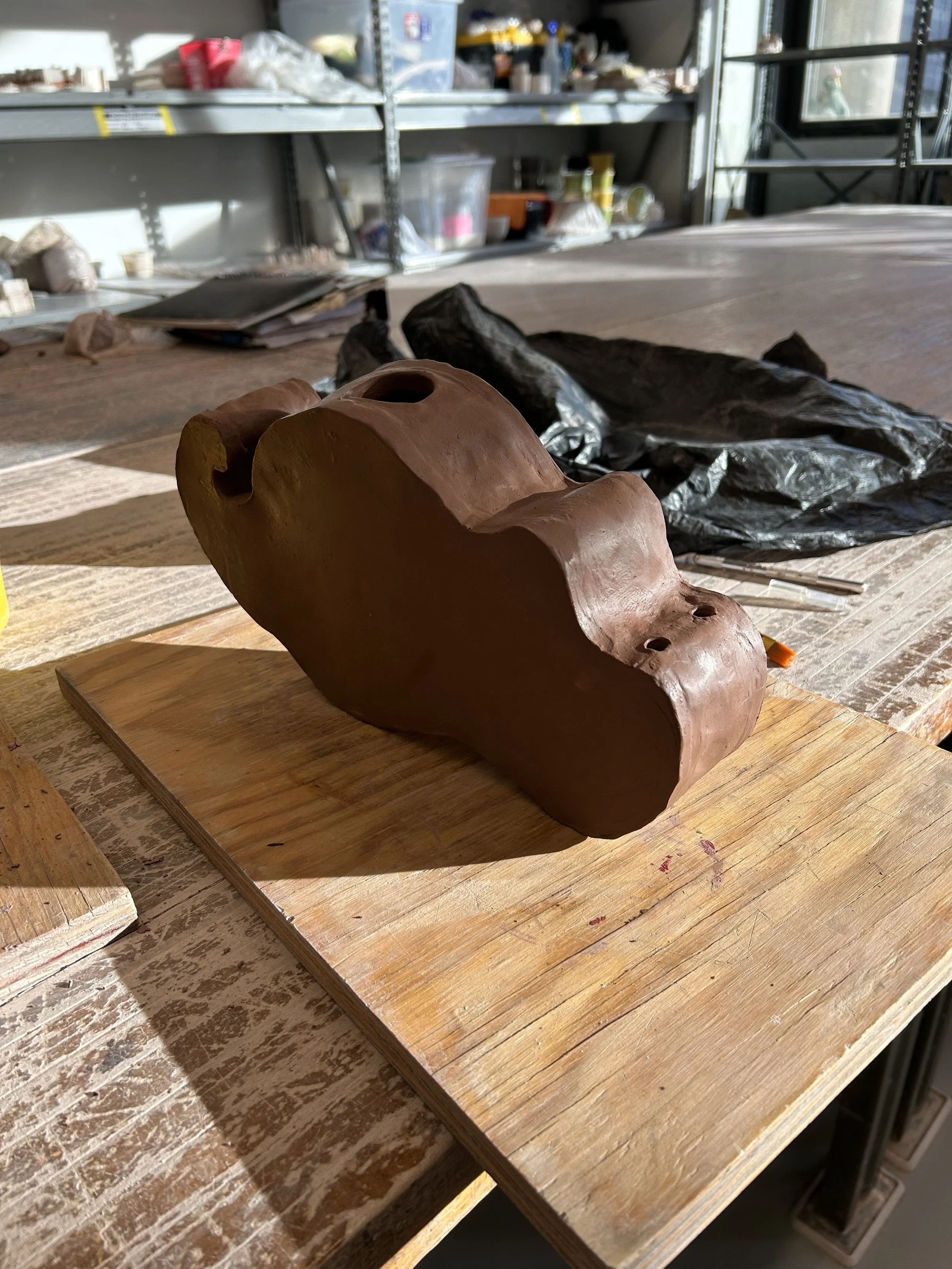 This project was to create an animal form, so I chose a seal. The figure was shaped, then hollowed out. He was bisque fired, then glazed, which was sprayed on.